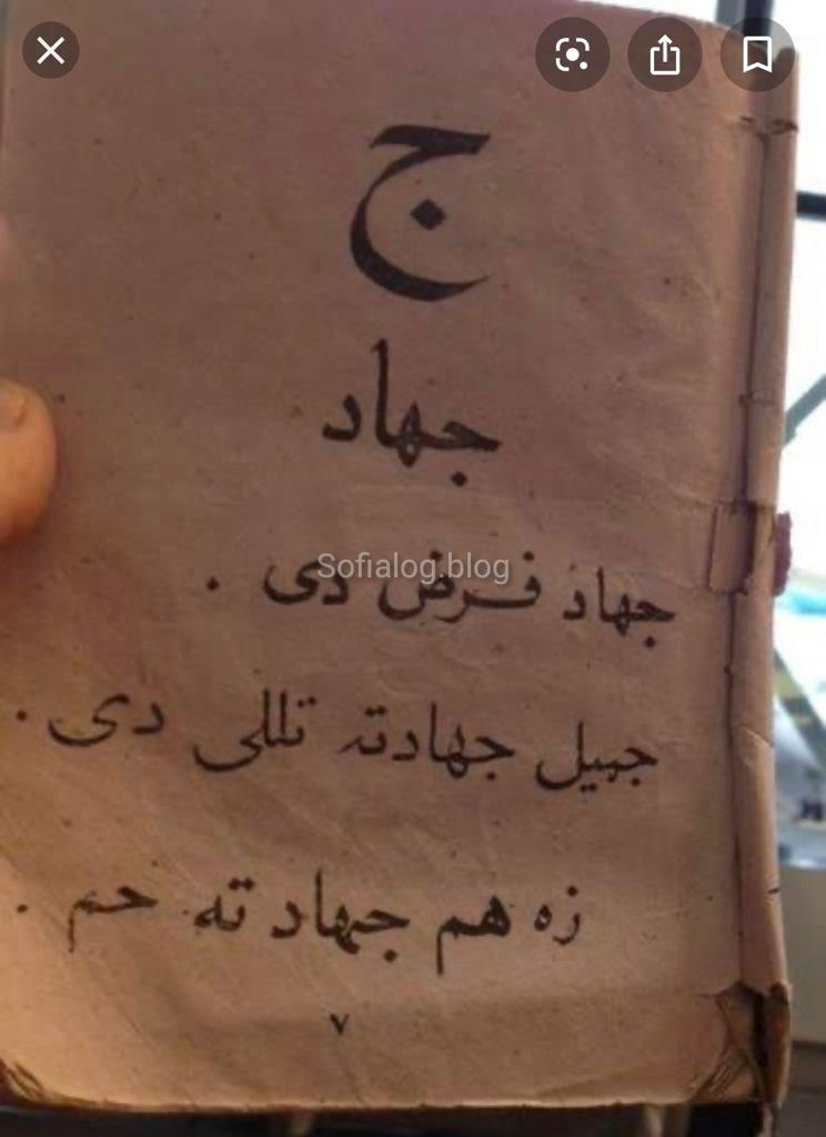 “ج جہاد ، جہاد فرض ہے ۔ جمیل جہاد پہ گیا ہے ۔ میں بھی جہاد پہ جاؤں گا ۔ “یہ ایک سوچی سمجھی سازش تھی تاکہ بچے بڑے ہوں تو جہاد کی تمنا ان کے دل میں اس قدر جاگزیں ہو چکی ہو کہ وہ جنگ کو زندگی کا نصب العین سمجھ لیں ۔ امریکہ کی یونیورسٹی میں چھپی چار ملین کتابیں بزریعہ پاکستان ٹرکوں میں لاد کر افغانستان لائی گئیں اور سرکاری سکولوں میں تقسیم کی گئیں ۔ طالبان جب آئے تو انھوں نے بھی یہی نصاب رہنے دیا ۔ البتہ کتاب میں کندھے پہ میزائل رکھے مجاہد کے سر پہ پینسل پھیر کر اسے چھپا دیا۔